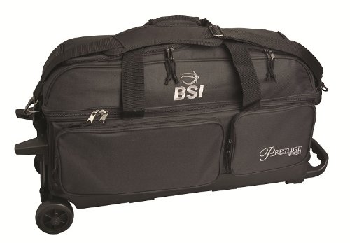 BSI 1306 Prestige series triple ball roller bag in black and silver logo has three padded ball compartments and personal organizer pockets. This bag utilities smooth rolling wheels and a retractable square tubular handle for easy transportation.