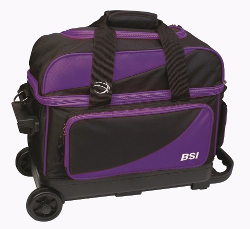 BSI 3202 double ball roller bag in black and purple has dual padded ball compartments, separate shoe compartment and personal organizer pocket. This bag utilizes smooth rolling wheels and a retractable square tubular handle for easy transportation.