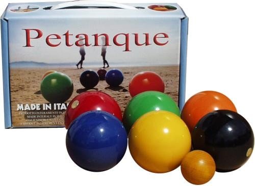 Having played both bocci and pentanque for many years now, I know what a pentanque set looks like and it don't look like this. The games are similar but not "just like" each other as the description indicates. Petanque boules (balls) are smaller, made of metal and are manufactured within specific ranges of diameter and weight. In petanque, the boule is not "rolled". Bocci balls are rolled, as in bowling, and can be played on grass and sand. Petanque, on the other hand, is a "lofting" game. The boules are lofted towards the jack and may roll a bit or not and the game cannot be played on grass or sand as the lofted boule would bury itself in the sand or grass. The preferred playing terrain for petanque is hard packed earth as you might find on the wide walkways of an urban park, the infield of a baseball field or a dirt parking lot. I've built a petanque court (piste) on my property and made the playing surface out of compacted DG (decomposed granite). This product is...