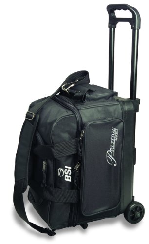 BSI 1106 Prestige series double ball roller bag in black and silver logo has dual padded ball compartments, separate shoe compartment and personal organizer pocket. This bag utilizes smooth rolling wheels and a retractable square tubular handle for easy transportation.