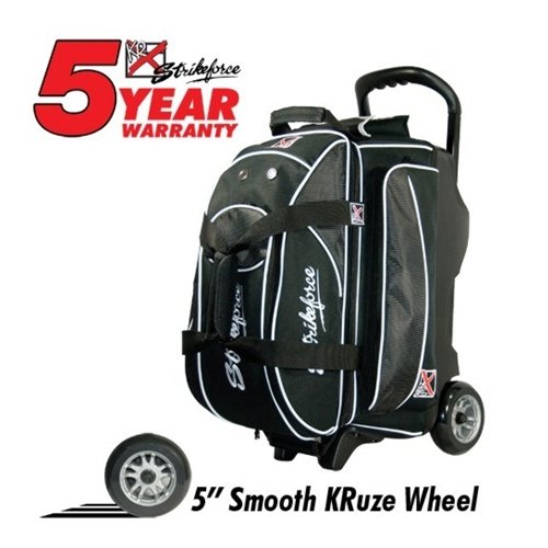 - Premium quality bag with deluxe features Retaining straps to secure bowling balls 5" Smooth KRuze urethane wheels with bearings for an ultra-smooth quiet ride Accessory pockets on both sides Vented shoe compartment stores shoes to size 15 600D fabric Retractable square locking handle extends to 35" Replacement handle #1127 Dimensions: 14" W x 18" D x 26" H
